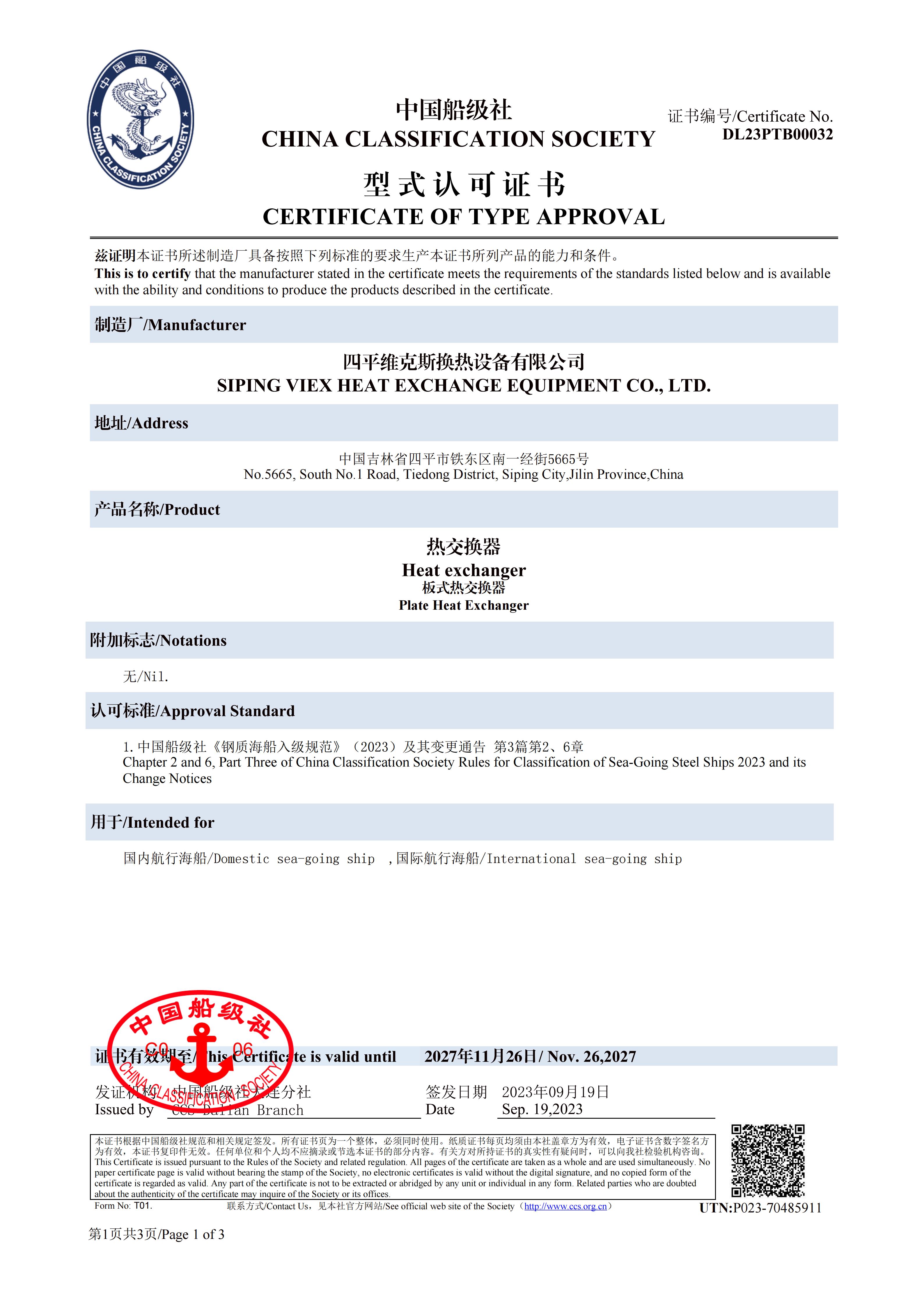 中国船级社型式认可证书